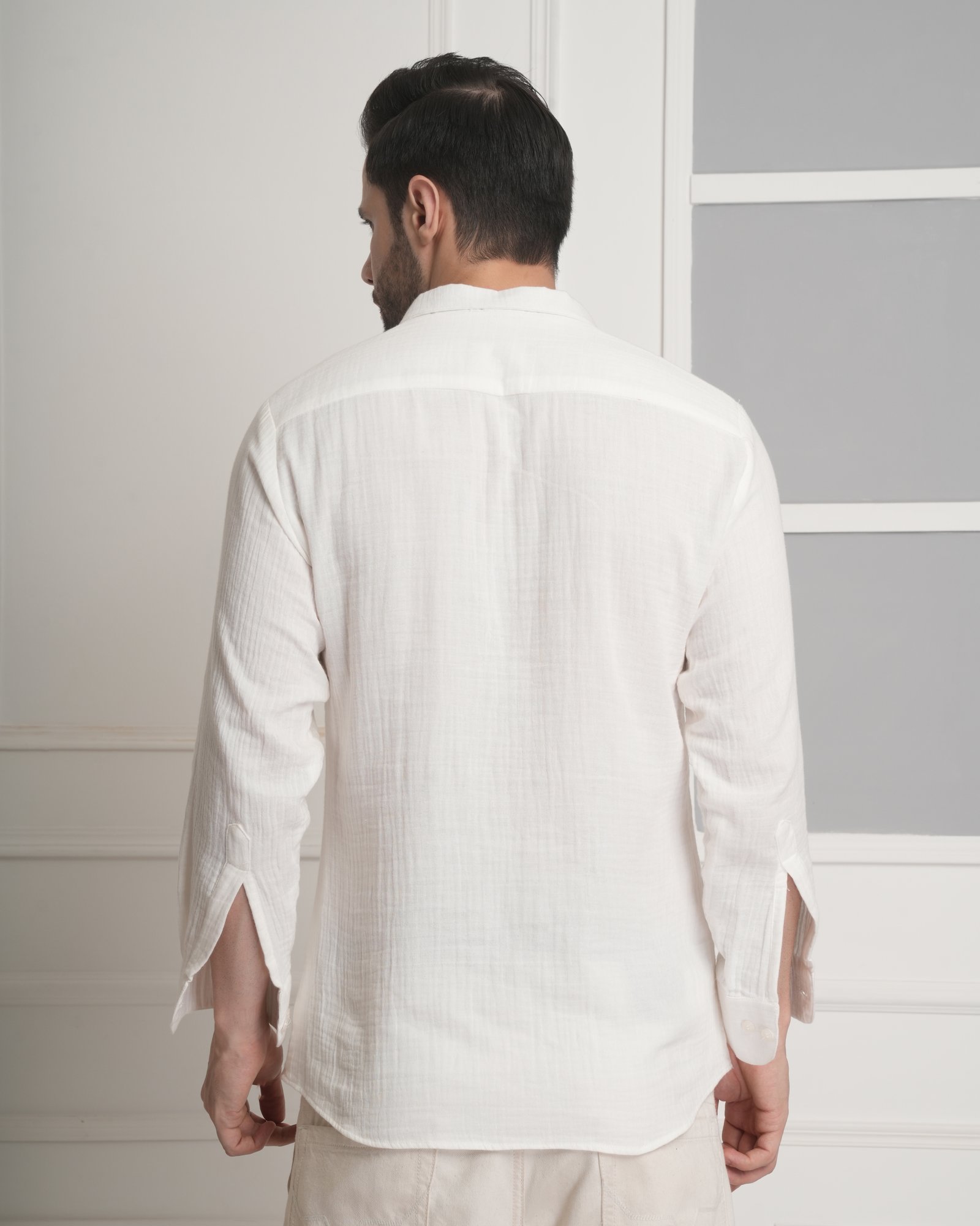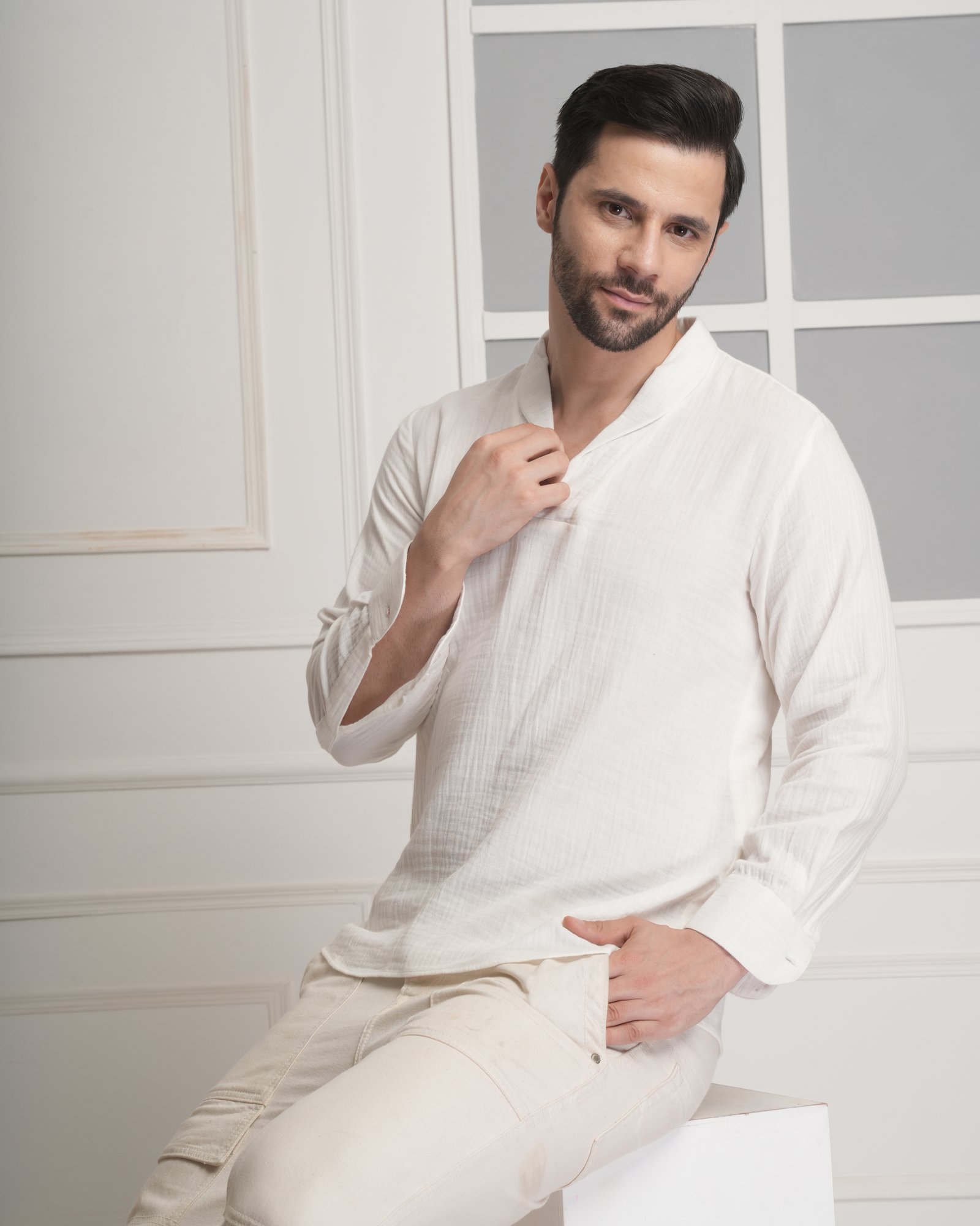 Its off-white tone brings a clean, minimalist appeal, making it a wardrobe staple for modern dressers. Wear it solo for a crisp, effortless look, or layer it under lightweight outerwear to transition seamlessly between seasons. From city strolls to weekend escapes and even understated festive gatherings, the Ivoro Shirt is your go-to for refined versatility.
