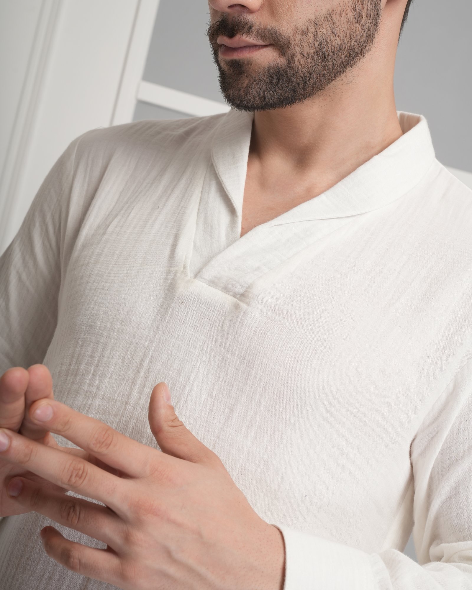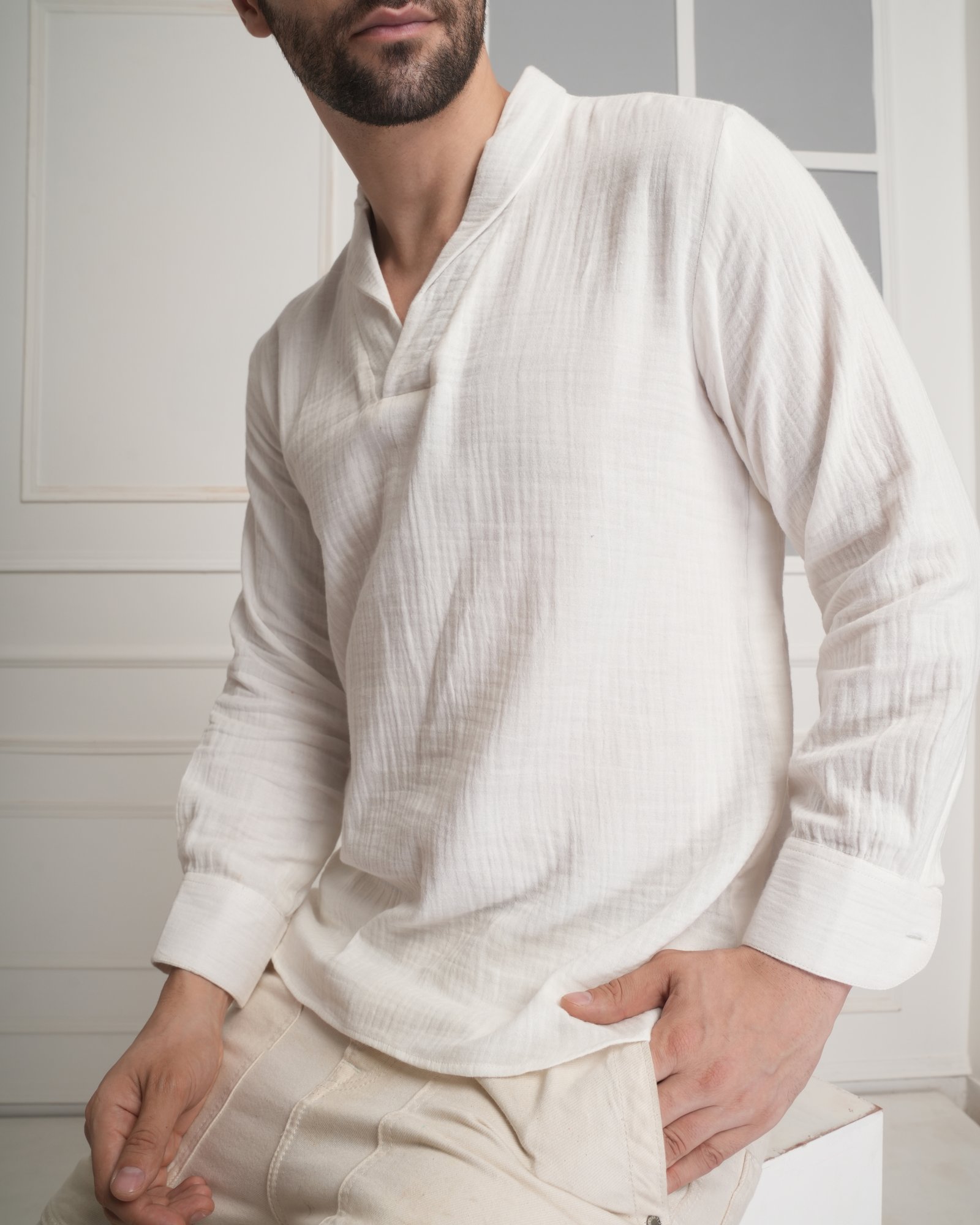 The Livyanshi Exclusive Ivoro Shirt is the embodiment of understated sophistication. Crafted from breathable, textured cotton, it offers comfort and elegance in equal measure. The relaxed, collarless neckline adds a contemporary edge, while the full-length sleeves — designed to be rolled with ease — provide flexibility for various styling moods.