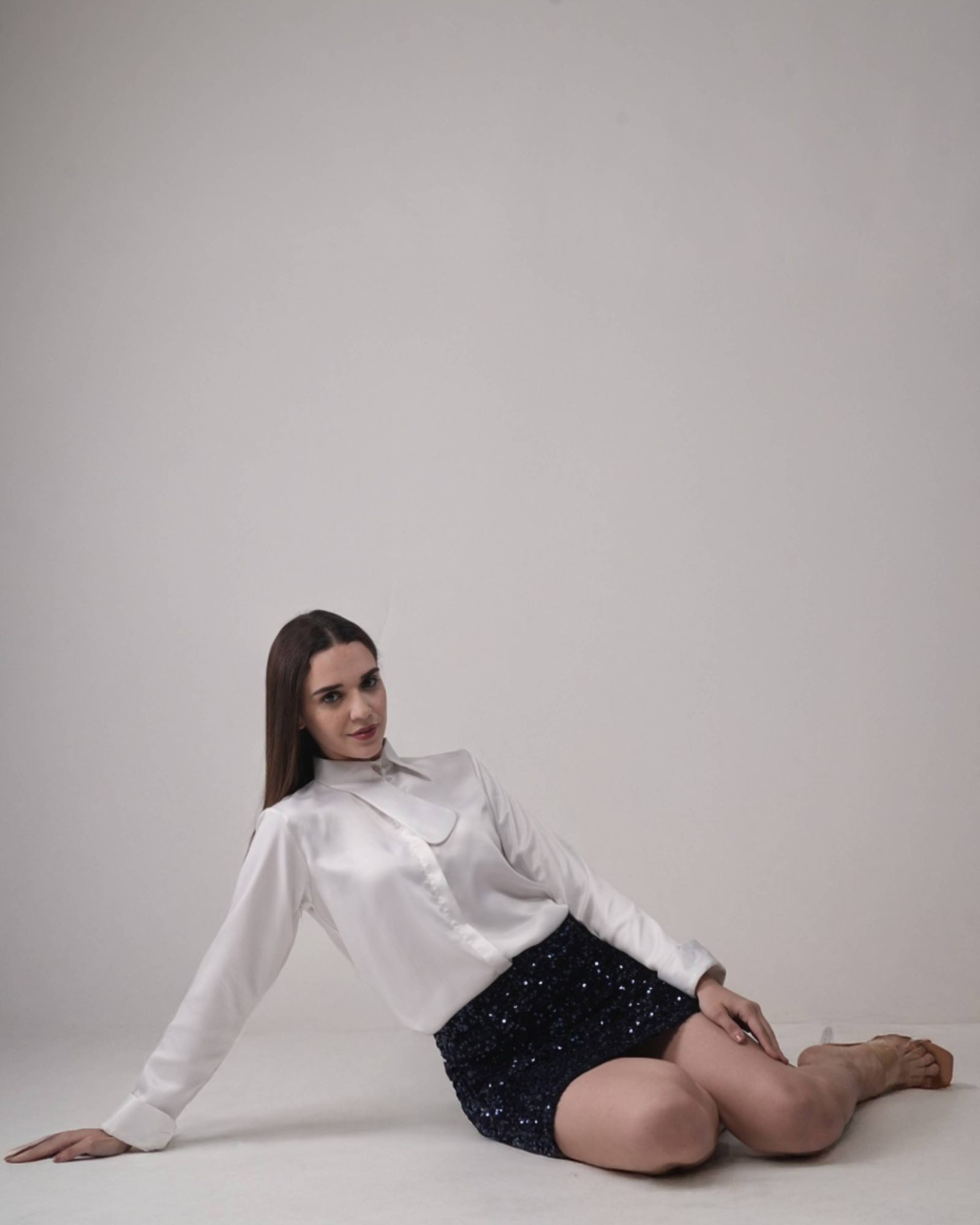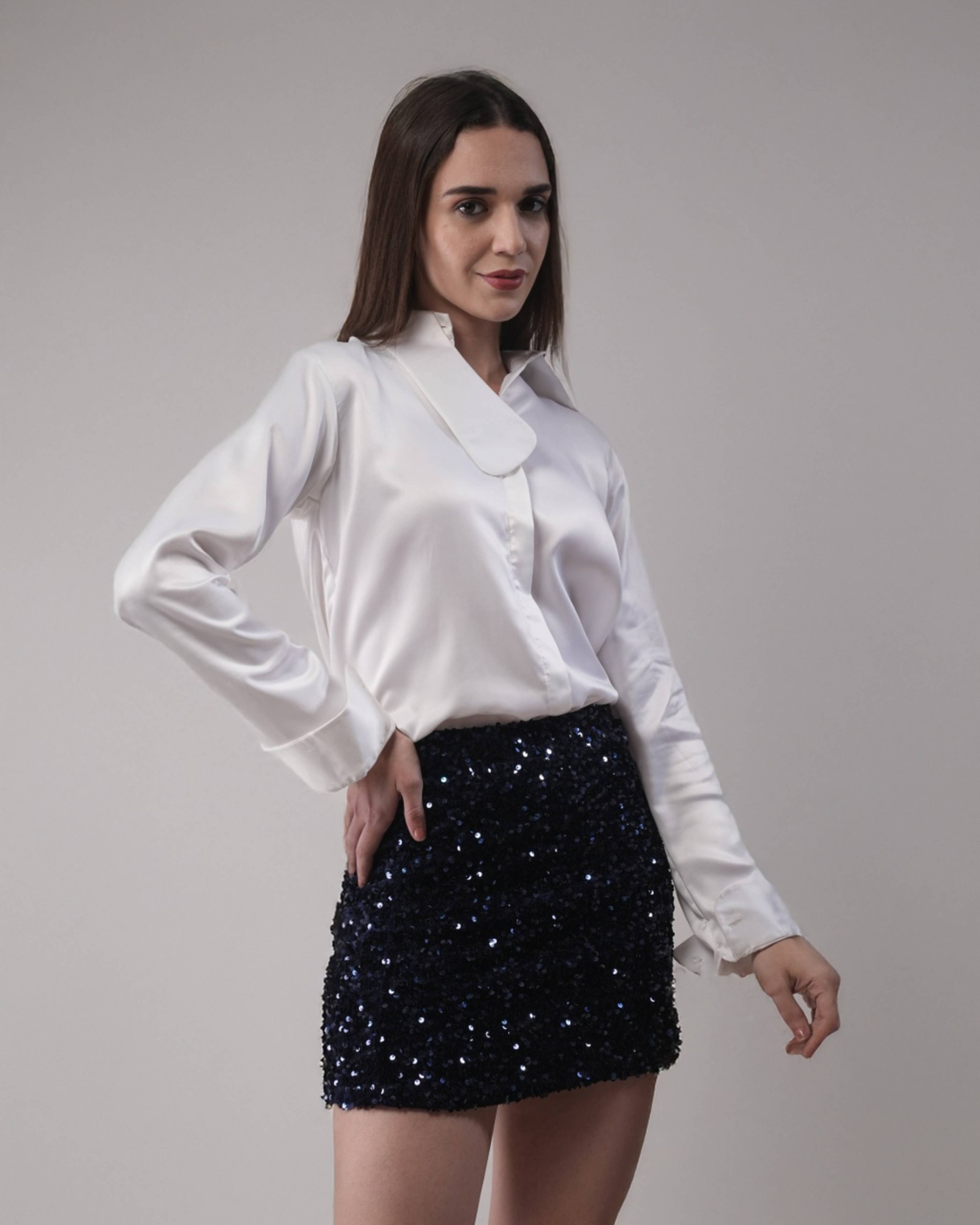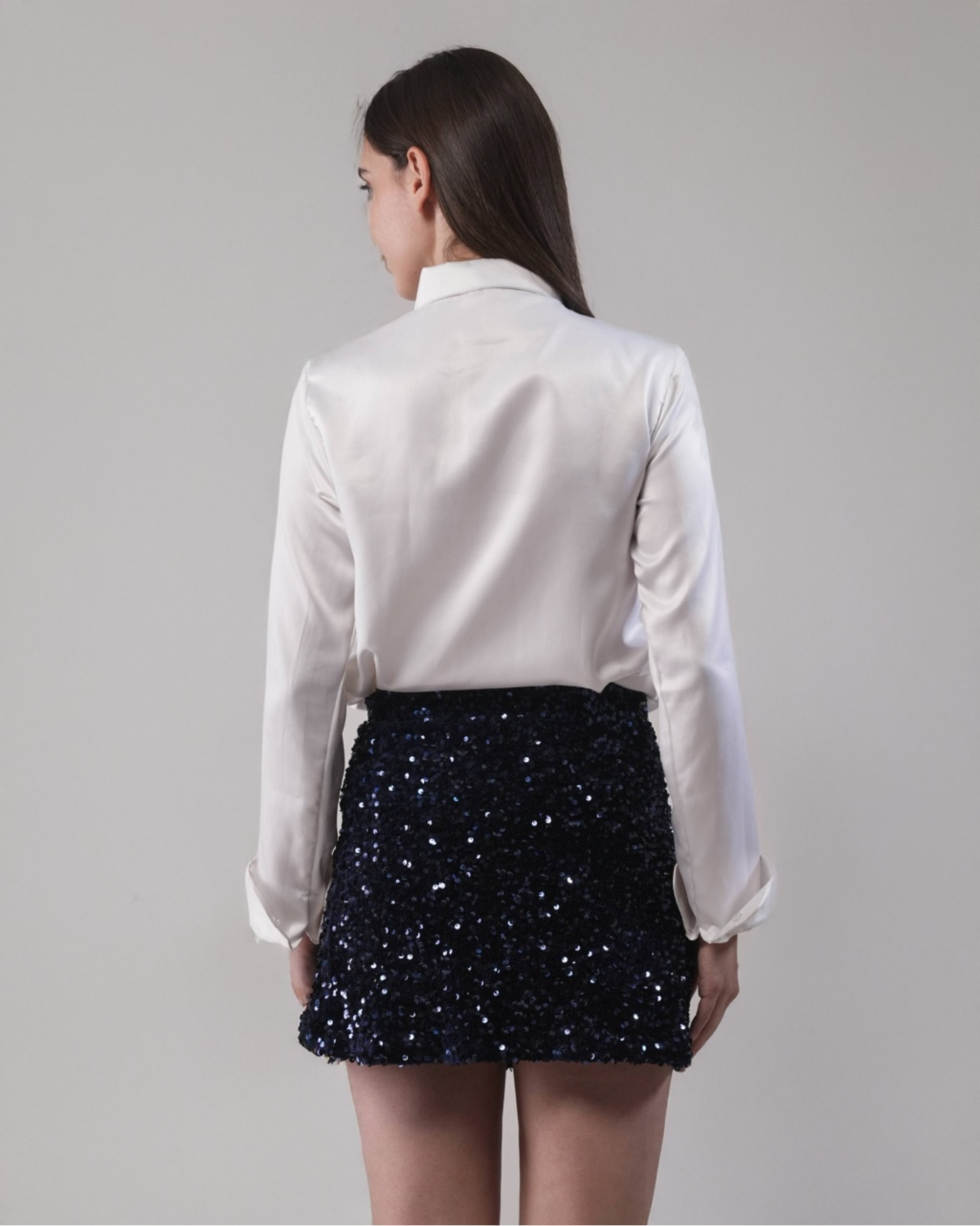 A high-waisted mini skirt with a sleek silhouette and delicate texture, designed for effortless sophistication.